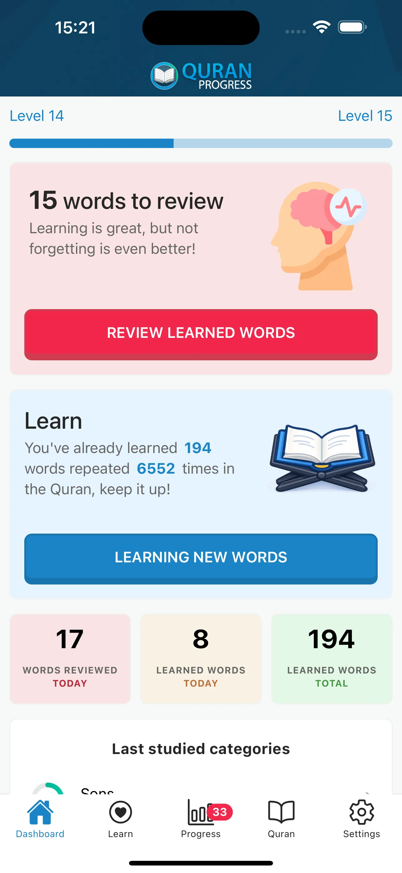 Track your journey day by day. Every word you learn brings you closer to understanding the Quran in your prayers and daily reading.